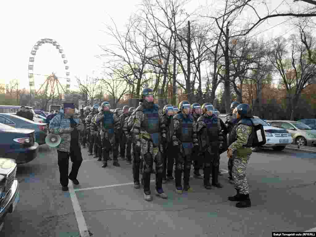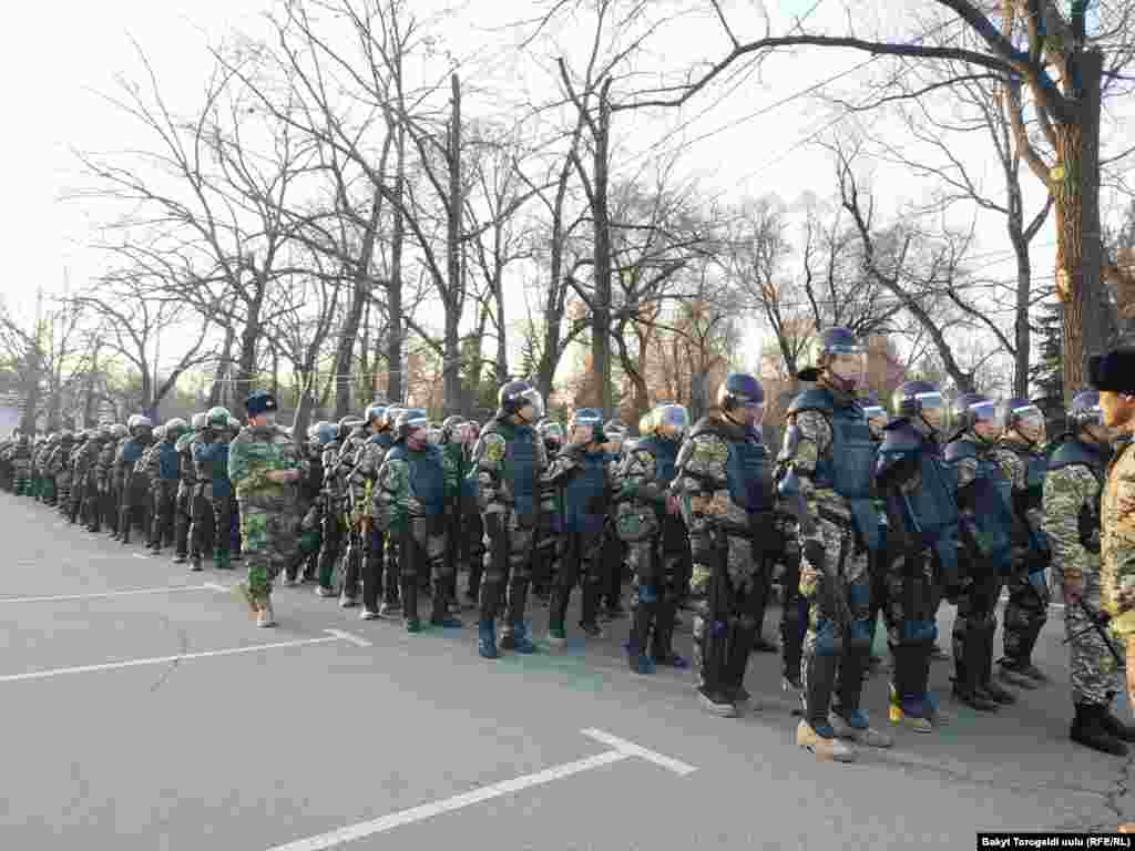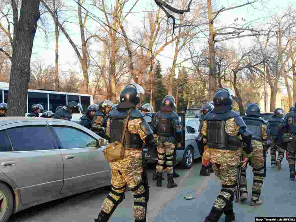 Атайын даярдыктагы күчтөр, милиция кызматкерлери суу бүркүп, көздөн жаш агызуучу газ колдонуп, кулак тундуруучу гранаталарды ыргытуу менен Ала-Тоо аятындагы жана Ак үйдүн алдындагы чогулган элди кууп таркатып жатат.